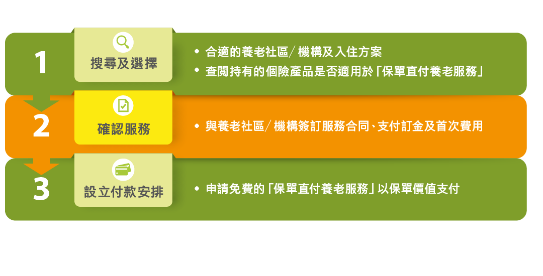 只需簡單三步,即可通過「保單直付養老服務」,享受無憂退休生活!